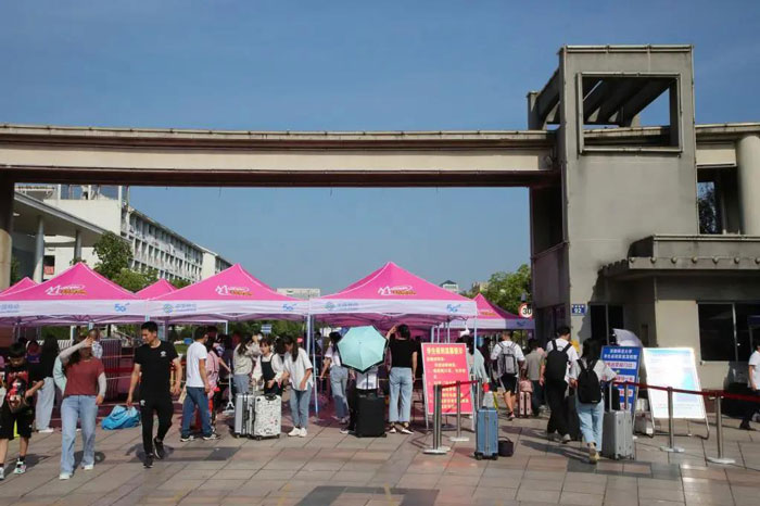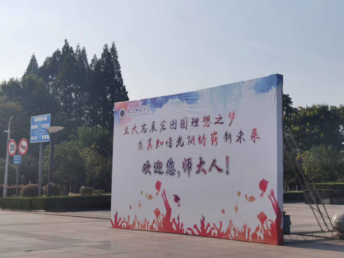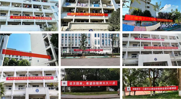 各学院一幅幅温情而又俏皮的条幅标语悬挂在宿舍楼和道路旁