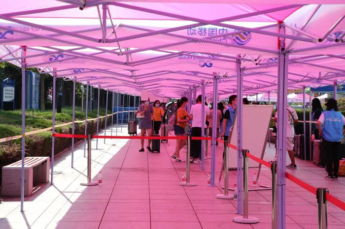 校门口早早的支起了一条“帐篷通道”为同学们遮阳