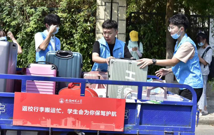 在返校现场帮助返校学生搬运大件行李