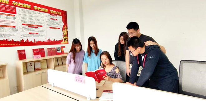 党史学习阅读角——设立学生读书角,学生自学为主,结合主题班会、行家党课、专题讲座、研讨会等多种形式,促进学生认真学习《中国共产党历史大学生读本》、《中华人民共和国史大学生读本》、《改革开放史大学生读本》、《社会主义发展史大学生读本》、《道路何以自信》、《理论何以自信》、《制度何以自信》、《文化何以自信》等书目。