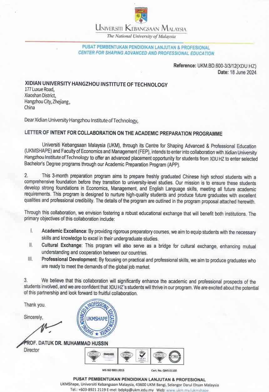 马来西亚国立大学(UKM)通过其高等职业教育塑造中心(UKMSHAPE)和经济与管理学院(FEP),打算与西安电子科技大学杭州研究院合作,通过我们的学术准备计划为西安电子科技大学杭州研究院的学生提供提前入读机会,让他们进入选定的学士学位课程。